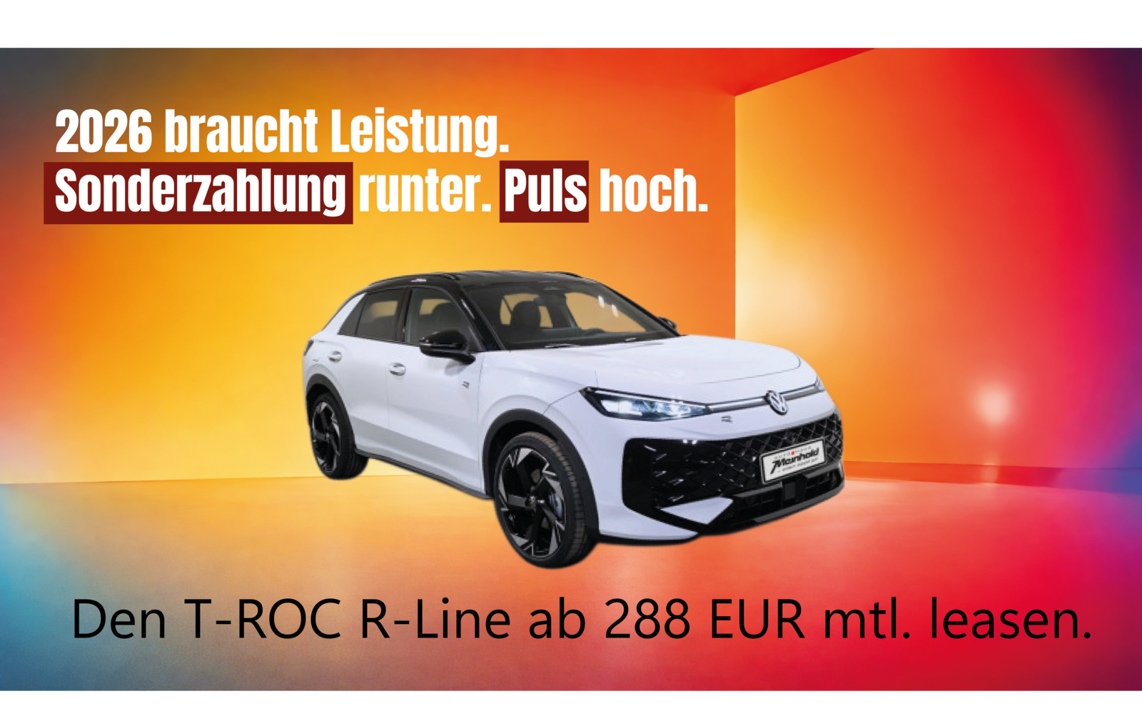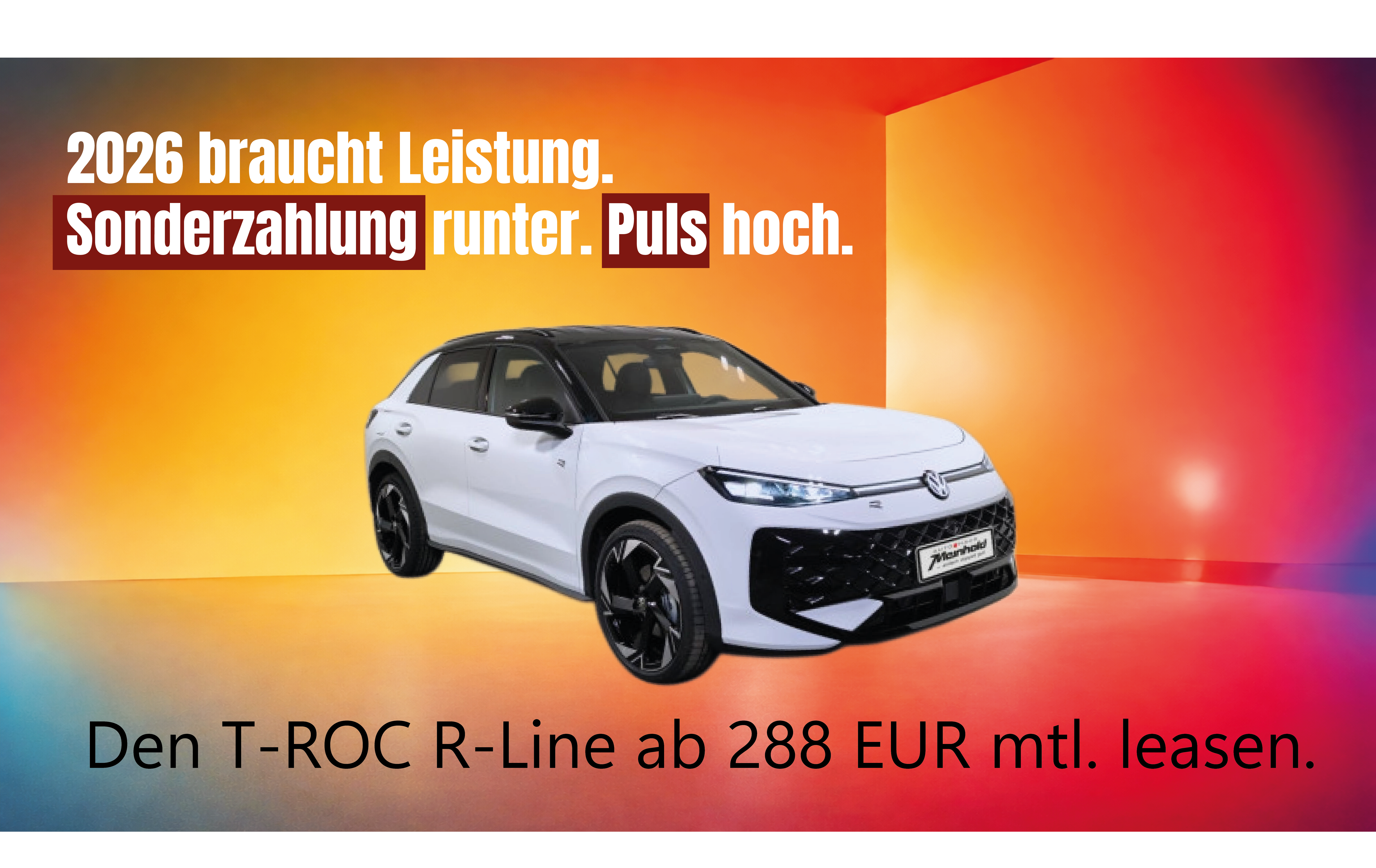 Mit unseren Volkswagen Leasingangeboten 2026 starten Sie ohne Umwege durch: 2026,- EUR Sonderzahlung für alle Modelle, überschaubare Laufzeit und ein echtes Highlight inklusive.