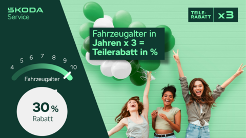 Is your Škoda at least four years old? Then you can save a lot on a repair with us... The age of your Škoda x 2 is the discount in % for vehicle parts that we use when servicing or repairing your Škoda. It's that simple: Vehicle age in years × 2 = discount in % on Skoda Genuine & Economy parts. Exam